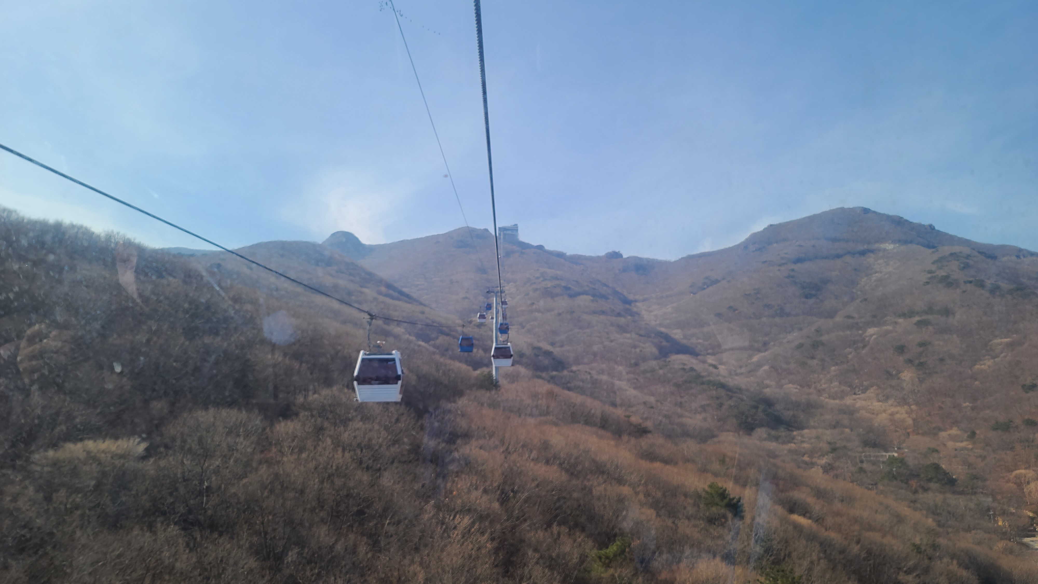 옛날 노자산 자연휴양림에서 1박한 추억을 더듬으며,바로 그 위로 케이블카가 지나간다. 감회가 새롭다.