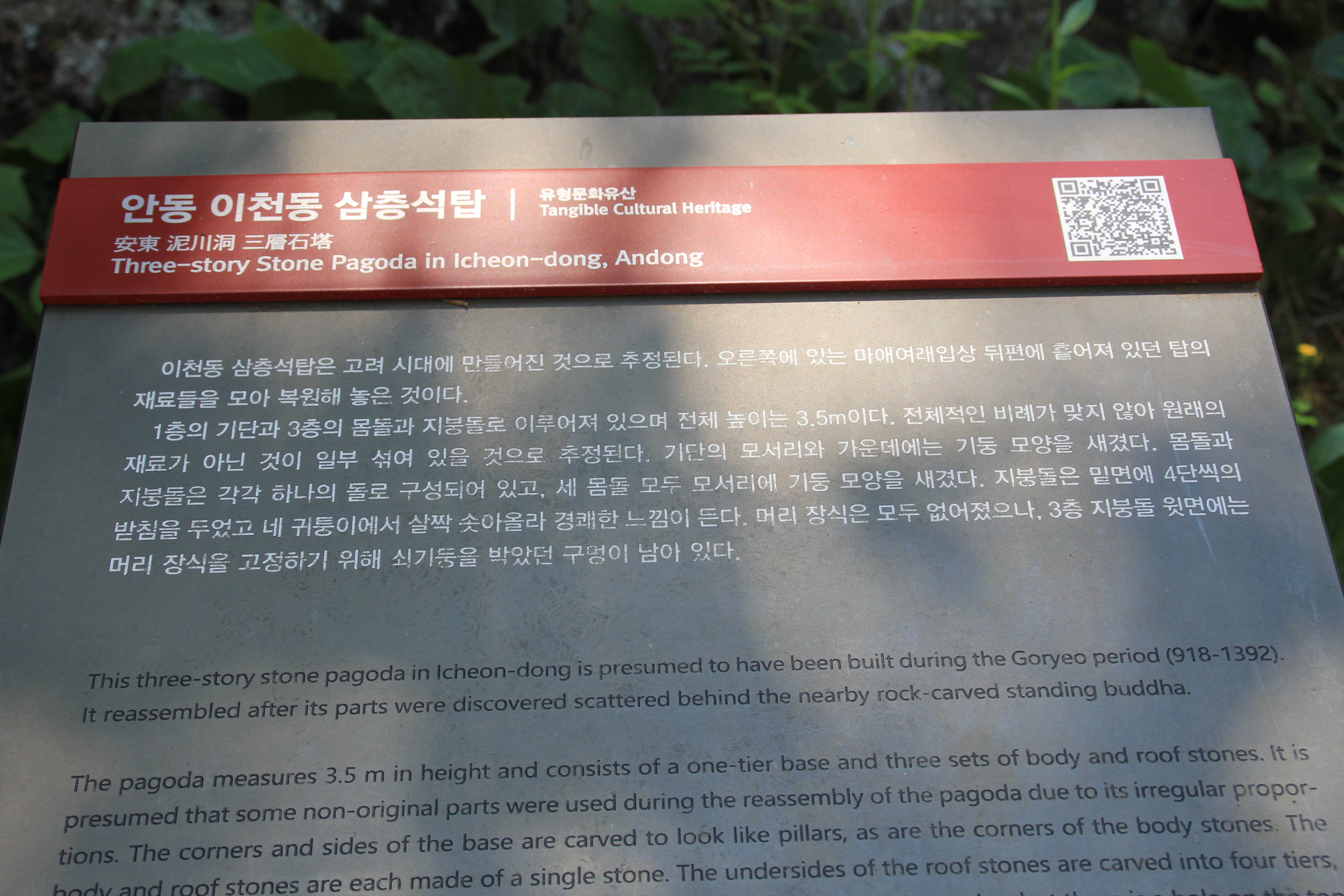 미륵전 입구에서 오른쪽으로 올려다보면 보이는 안동이천동삼층석탑입니다.안동이천동삼층석탑은 경상북도 유형문화재 제99호로 지정되어 있으며 마애여래입상 뒤쪽으로 흩어져 있던걸 모아서 복원했다고 합니다.