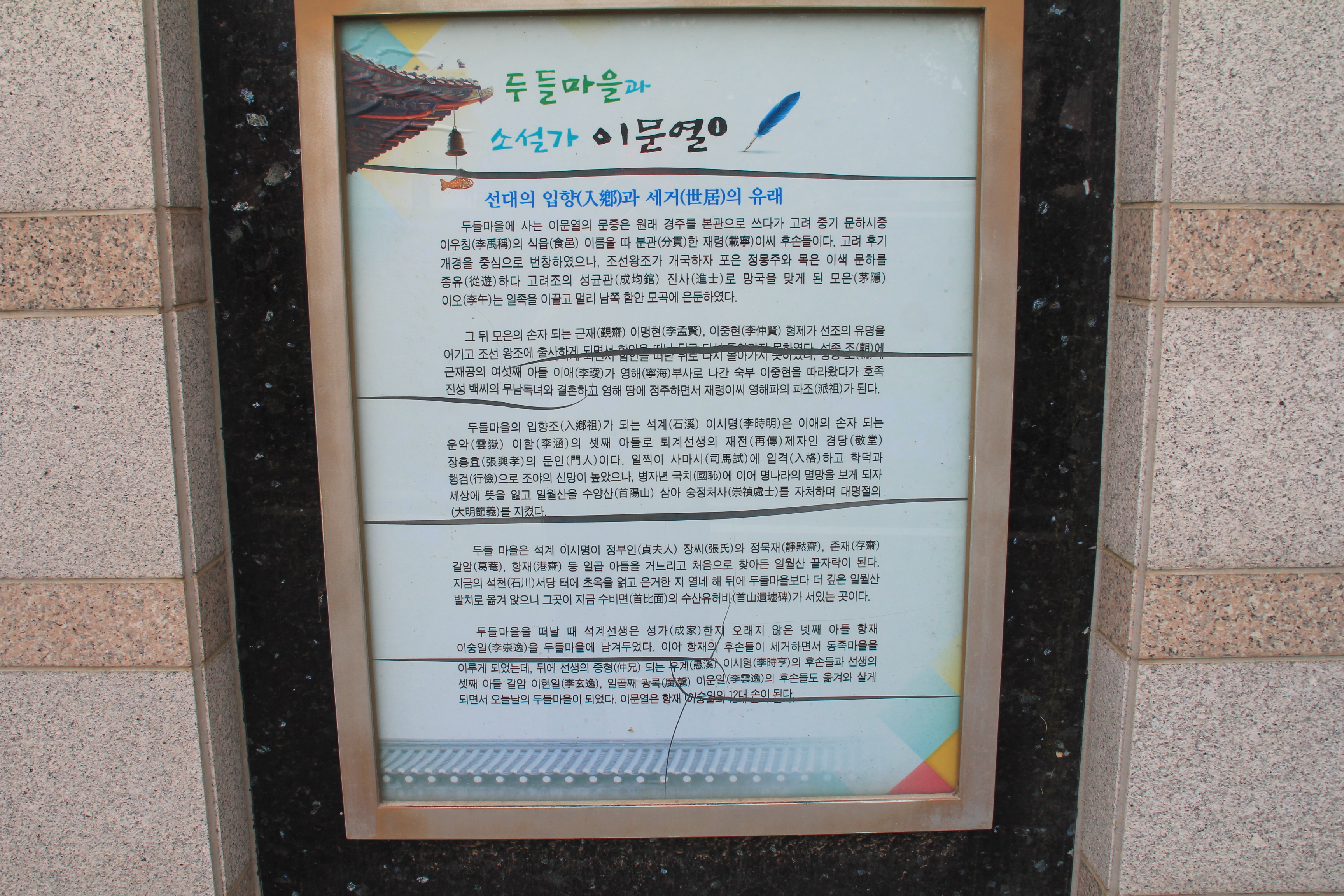 마을은 낙안오씨(樂安吳氏) 집성촌이다. 400여 년 전 통정대부를 지낸 오시준(吳時俊)이 처음 터를 잡았다고 전한다. 천변에서 조금씩 물러난 구릉진 땅의 형세대로 집들이 들어서 있다. 기와를 얹은 흙돌담 길이 넉넉하게 휘어지며 부드럽게 울렁인다. 오일도의 생가는 이 마을의 한가운데 자리한다. 그의 조부 오시동(吳時東)이 1864년에 지은 집이다.
